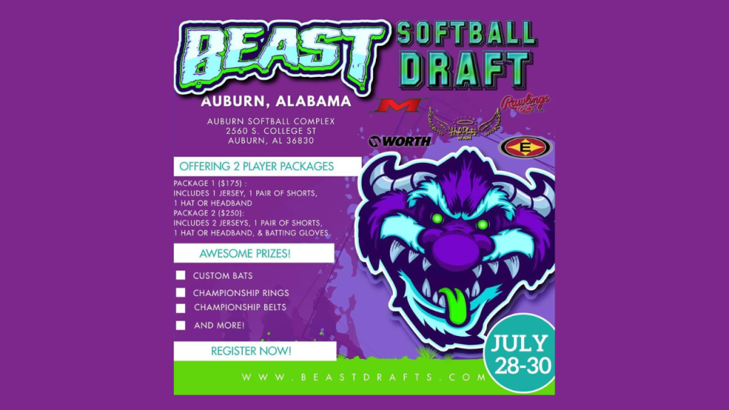 It’s time to Unleash Your Beast with Beast Softball Drafts. Join us in Auburn, AL for the Beast Ultra Draft at Auburn Softball Complex. Players will register individually, and teams are created before each event. The format is fun and allows players of all skill levels to participate, have fun, and have a chance to win.