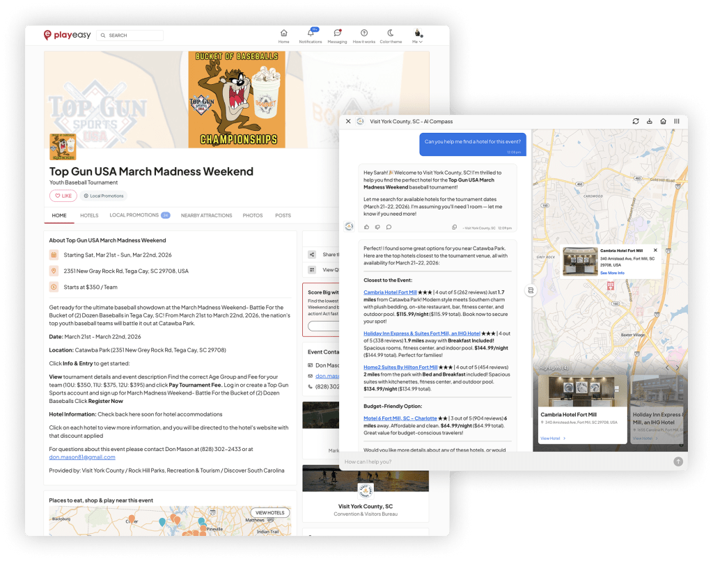 Playeasy is built around events — and Compass changes what event organizers can offer their attendees. Until now, trip planning resources for event attendees meant static content on a webpage. A list of hotels. Maybe a map. Content that sits there and hopes someone reads it.