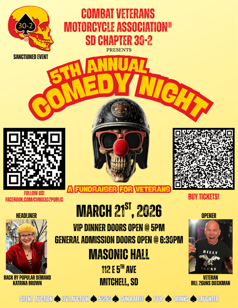The fun and laughter continues for our 5th annual comedy night fundraiser event! Back by popular demand, Katrina Brown will take the stage with fresh new jokes that’ll have you rolling. Opening this year will be Veteran comedian Bill ‘2 Guns’ Dieckman. You’ll find us at a new venue and offering pre-show dinner and meet and greet at the beautiful Masonic Hall in downtown Mitchell, SD. Bring your friends and laugh off the winter blues! See ya soon!