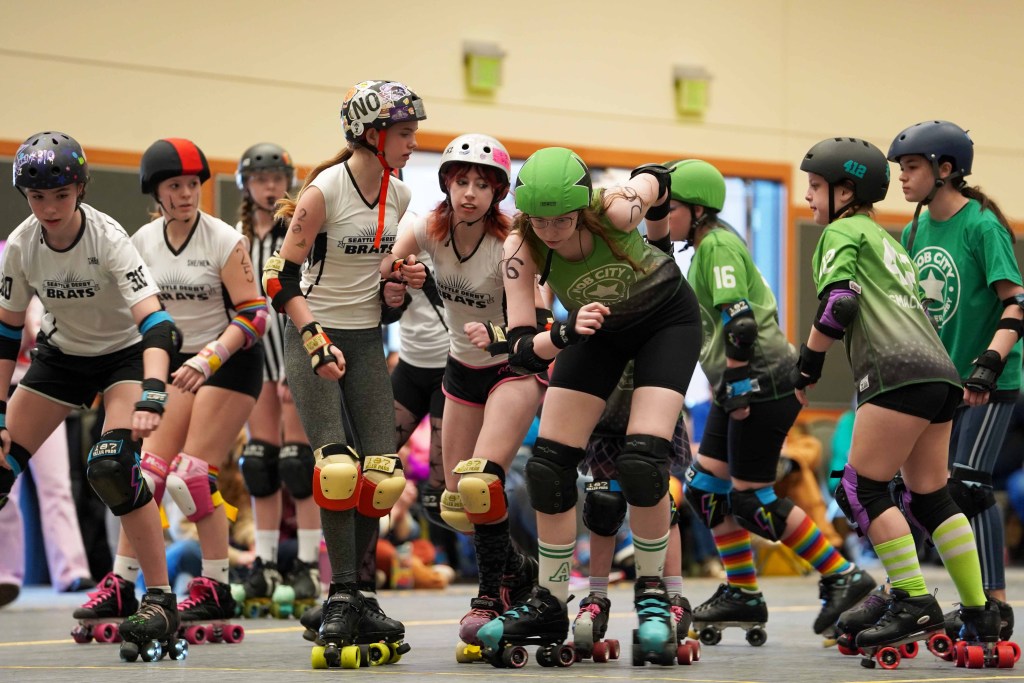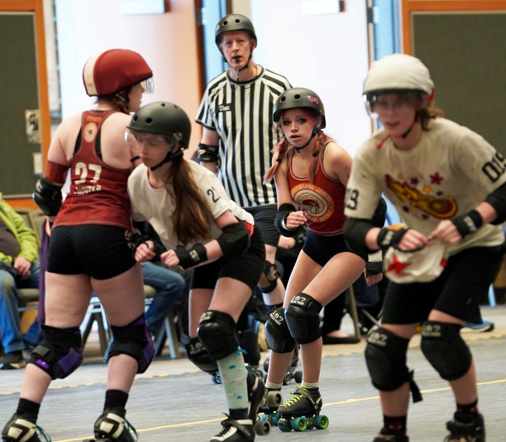 From Feb. 15-17, JCRD hosted a series of roller derby games at Edmonds College’s Seaview Gymnasium, featuring juniors (under 18), women’s (WFTDA) and coed (Men’s Roller Derby Association (MRDA)) divisions. The home teams were Mob City (juniors), Jet City (WFTDA) and Puget Sound Outcasts (MRDA).